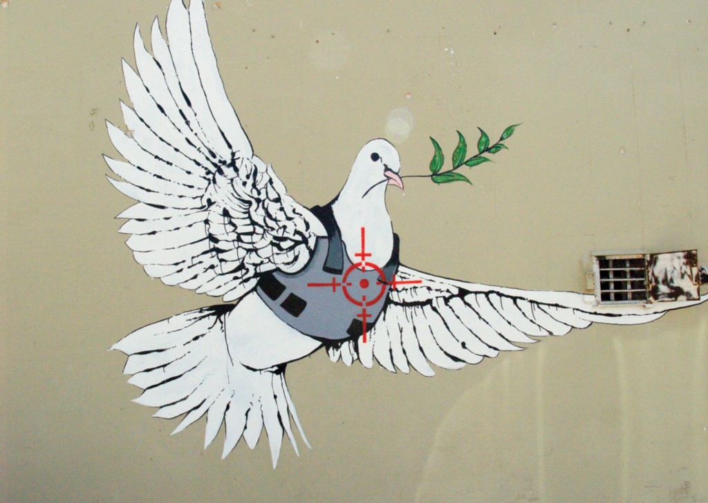 Banksy is a street artist, political activist and film director. He also used different art forms to exposed his idea such as films and graffiti. But his graffiti was very famous. In my opinion, the reason of his success is because he has a distinct personal style and his graffiti is easy to understand. He always use the dark humor with graffiti and use that method to come up his mind about anti-war, anti-capitalist or anti-establishment. whenever you see his work, you will feel strongly that the image in the painting which want to live in the freedom and peaceful world. Banksy’s works are mainly composed of black and white. But what stuff can express the love or peace it will be colorful. For example, a heart-shaped balloon in the hand of a little girl and a bouquet in the man’s hand are both colored.