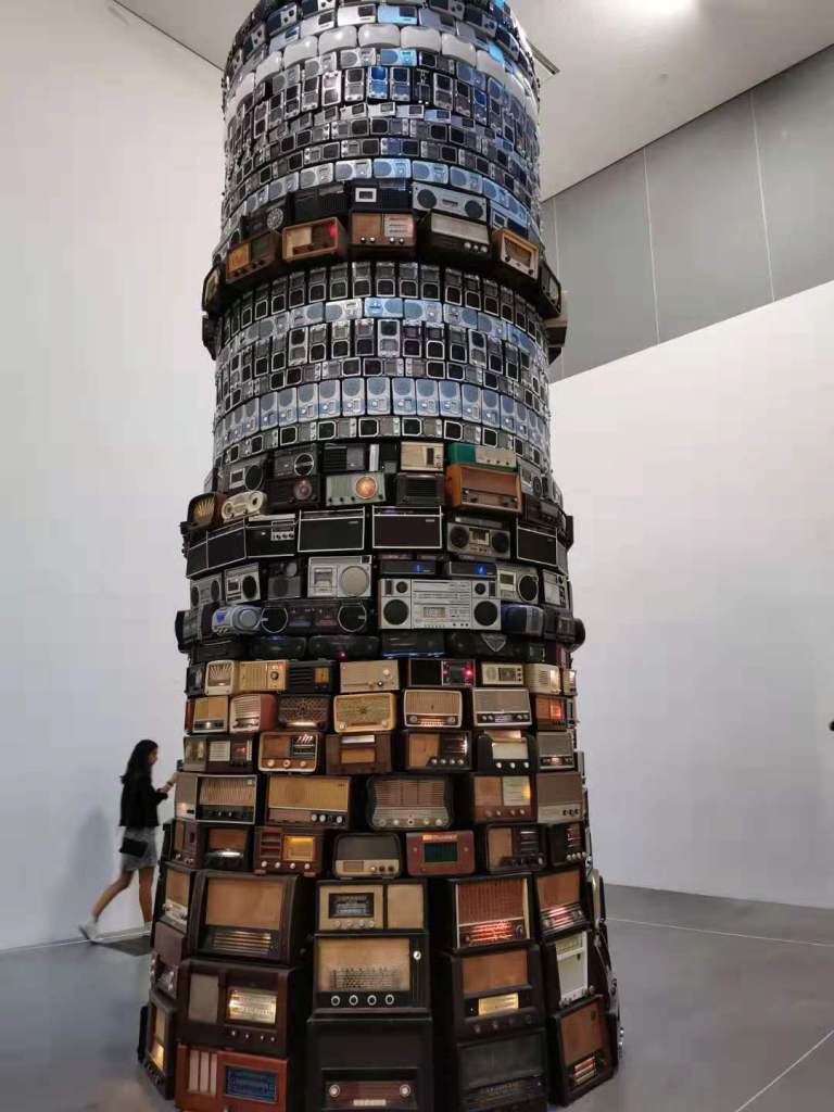 What impressed me the most in the exhibition was the tower with radios of different ages. The lowest level radios are the oldest and the highest level radios are the latest. This tower is very spectacular work and every radio is working. Nowadays most people not use radios at home. These radios of different ages not only witness the development of times but also the recycling of the radios .